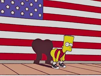 Dans l’épisode 21 de la saison 15, “Le Drapeau… potin de Bart” (diffusé le 16 mai 2004), les ennuis commencent avec Bart, qui montre accidentellement ses fesses au drapeau américain, acte vu par tous comme le parangon de l’anti-patriotisme.