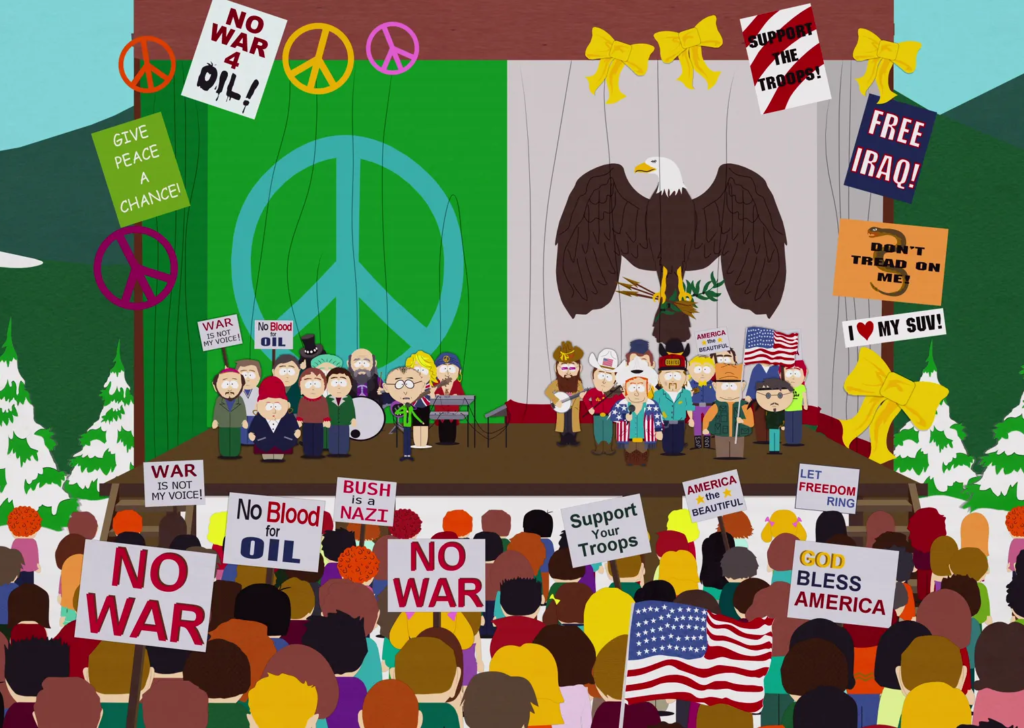 Dans l’épisode “Plutôt du genre country” (saison 7, épisode 3), diffusé le 9 avril 2003, les scénaristes de South Park critiquent ouvertement l’hypocrisie de la société américaine vis-à-vis de la guerre en Irak.