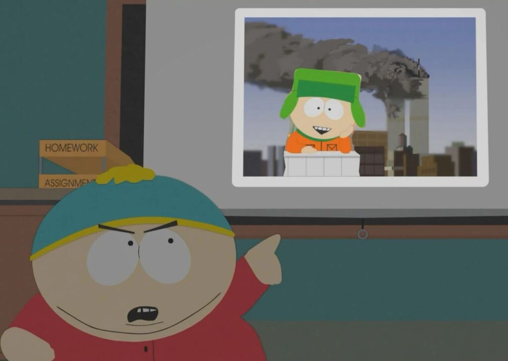 Dans l’épisode “Le Mystère du caca dans l’urinoir” (saison 10, épisode 9), diffusé le 11 octobre 2006, M. Mackey enquête pour savoir qui a laissé une crotte dans les toilettes des garçons. Cartman suspecte qu’il peut s’agir d’une conspiration, tout comme celle des attentats du 11 septembre – d’ailleurs il accuse Kyle d’avoir envoyé les avions. Kyle doit alors prouver que c’est bien le gouvernement derrière les attentats et pas lui. Après moult péripéties, le président George W. Bush lui avoue que le gouvernement est bien responsable des attentats, et tente de tuer Kyle, qui réussit à s’échapper. Finalement le président retrouve Kyle et lui annonce qu’il a menti en affirmant qu’il était responsable ; il voulait simplement prouver son pouvoir.