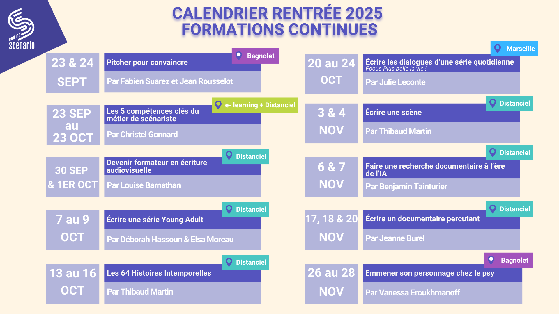 Les formations S Comme Scénario se déroulent désormais majoritairement à distance, vous permettant d’y participer où que vous soyez. En outre, toutes les formations S Comme Scénario sont éligibles à une aide au financement (jusqu’à 100%).